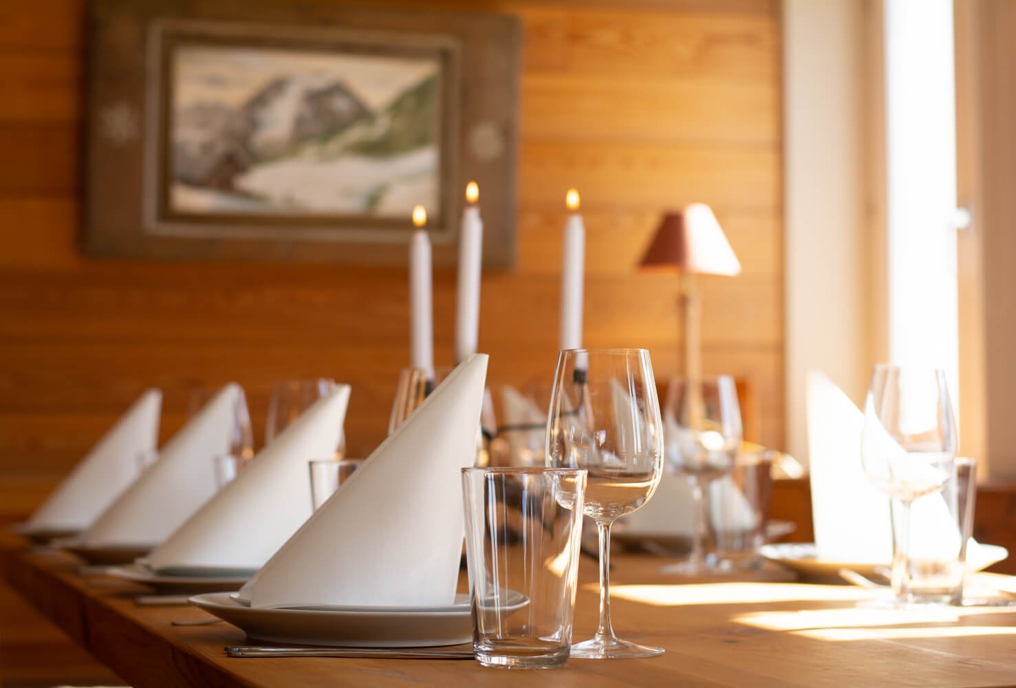 The large living area (approximately 55 m²) includes a spacious dining table, open fireplace and comfortable seating area, creating a relaxed space to gather after a day on the slopes. A south-facing terrace allows guests to enjoy the mountain setting throughout the day.